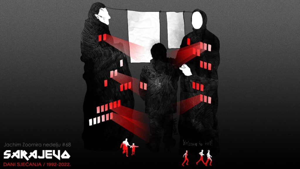 I ove godine Jaćko je obeležavala sve važne datume i održavala kulturu sećanja na žrtve ratova na ovim prostorima – kako u vreme Drugog svetskog rata, tako i ratova devedesetih godina. Bez kulture sećanja i priznavanja prošlosti – nema ni mirne i sigurne budućnosti na Balkanu. Motiv ilustracije je 30 godina od početka opsade Sarajeva i belo platno, slično onima koja su štitila građane/ke Sarajeva od snajpera tokom rata u BiH, postavljeno u centru Sarajeva u ponedeljak, 4. aprila.