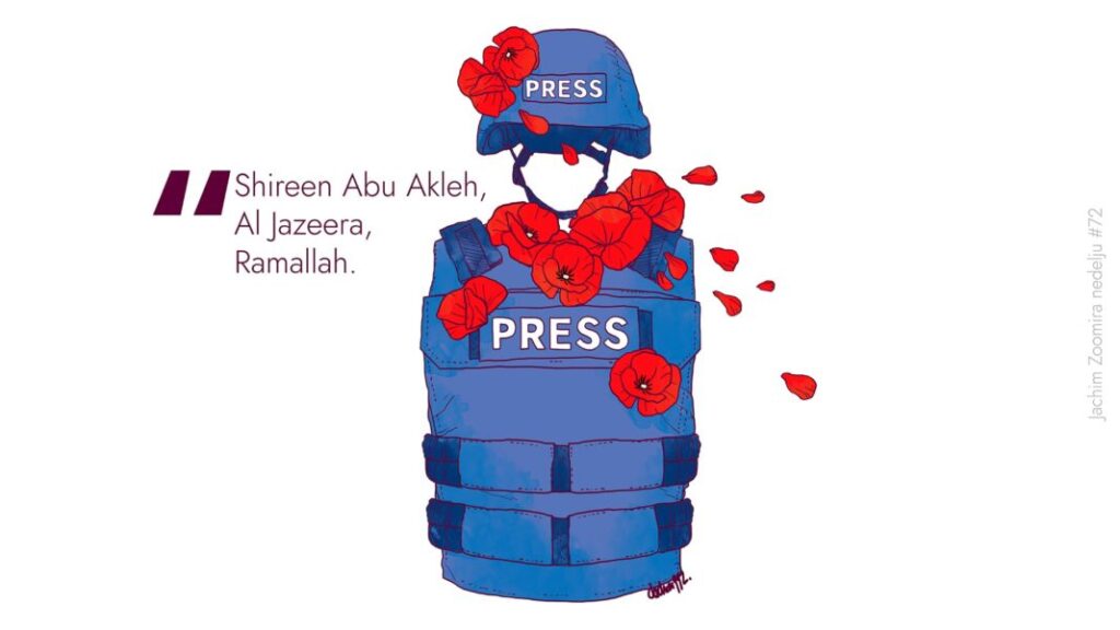 Kao što je ilustrovala medijsko iživljavanje nad žrtvama, tako je prikazala i zločine prema novinarima. Prema izveštajima, oni su u porastu – negde je nasilje suptilnije i manje jasno vidljivo kao u Srbiji gde se ogleda pre svega u pritiscima i pretnjama, a negde vrlo otvoreno i direktno. Motiv ove ilustracije je ubistvo novinarke Shireen Abu Akleh koja je izveštavala o ratu u Palestini.