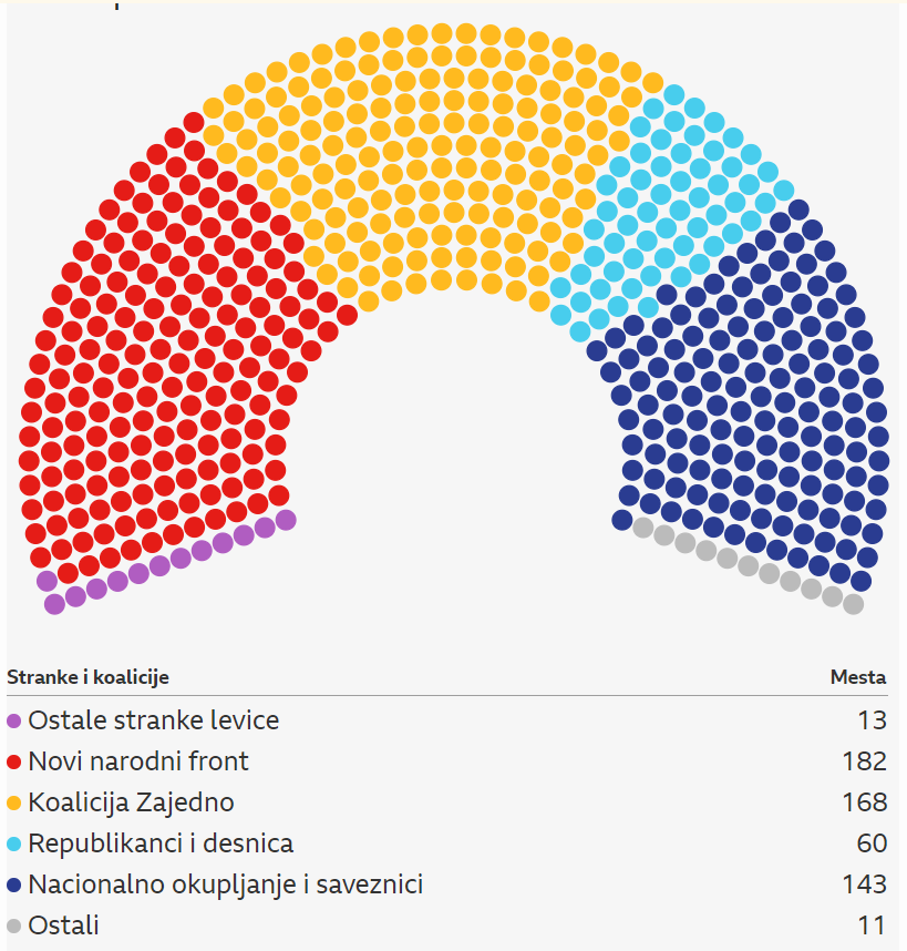 Francuski levičari, koji su podeljeni u više frakcija koje se politički ne slažu u potpunosti (okupljaju i „trockiste“ i radikalnu levicu i različite političke struje) zaboravili su na političke razlike i zajednički su istupili na izborima, a potom stavili po strani i razlike sa „centristima“ predsednika Makrona. Kada se na to doda velika izlaznost građana i građanki Francuske koji su izašli na izbore kako bi se suprostavili jačanju desnice – dogodio se ishod koji niko nije predviđao.